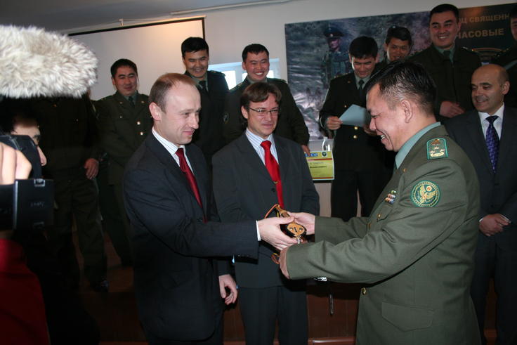 A Kyrgyz border police officer thanks two trainers from Austria on completing a training course on the identification of counterfeit ID documents, organized by the OSCE Centre in Bishkek, 12 December 2008.