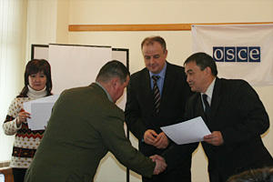 Prison staff who completed a training course receive certificates from the Deputy Head of the Kyrgyz Penitentiary System, Alibay Nyshanbaev (r), and the OSCE Centre in Bishkek's Advisor on Prison Reform, Miroslaw Nowak (c), Bishkek, 27 Feb 2009.