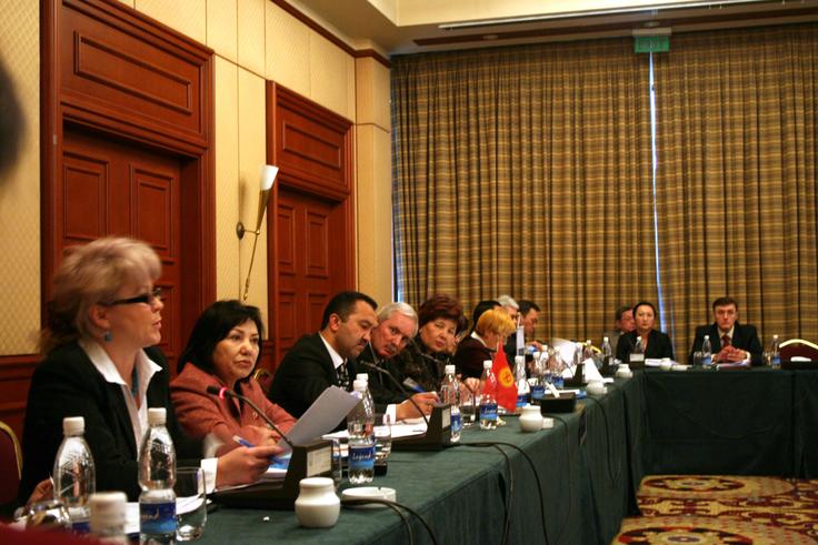 Kyrgyz MP Irina Karamushkina (l), watched by the Head of the OSCE Centre in Bishkek, Ambassador Andrew Tesoriere (r), addresses an OSCE-supported parliamentary hearing on gender legislation, Bishkek, 3 March 2009.