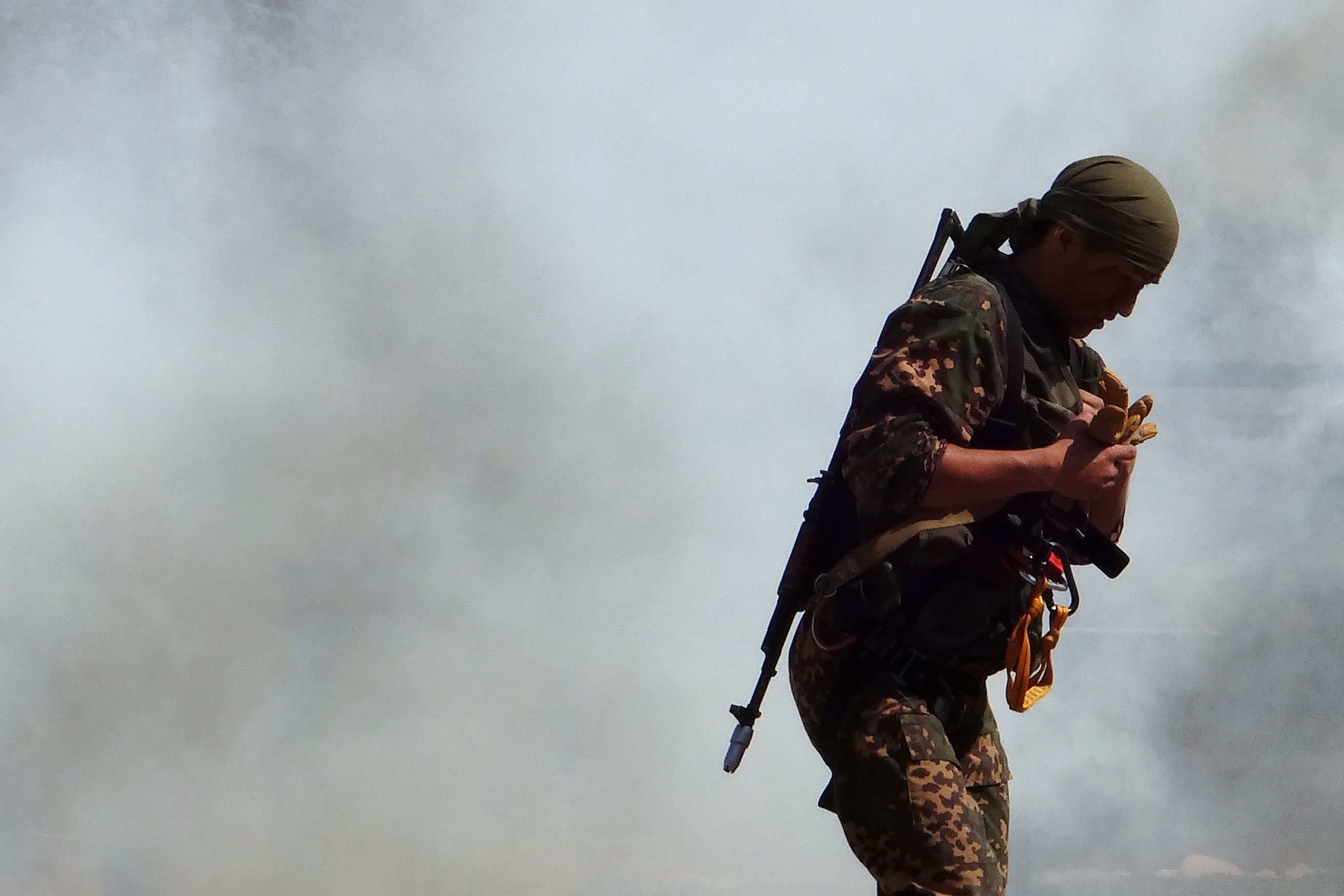 A soldier from Kyrgyzstan’s special forces brigade, known as the Snow Leopards, emerges from smoke during an obstacle course donated by the OSCE Centre in Bishkek along with other material for training anti-terrorism unit officers, 4 September 2013.