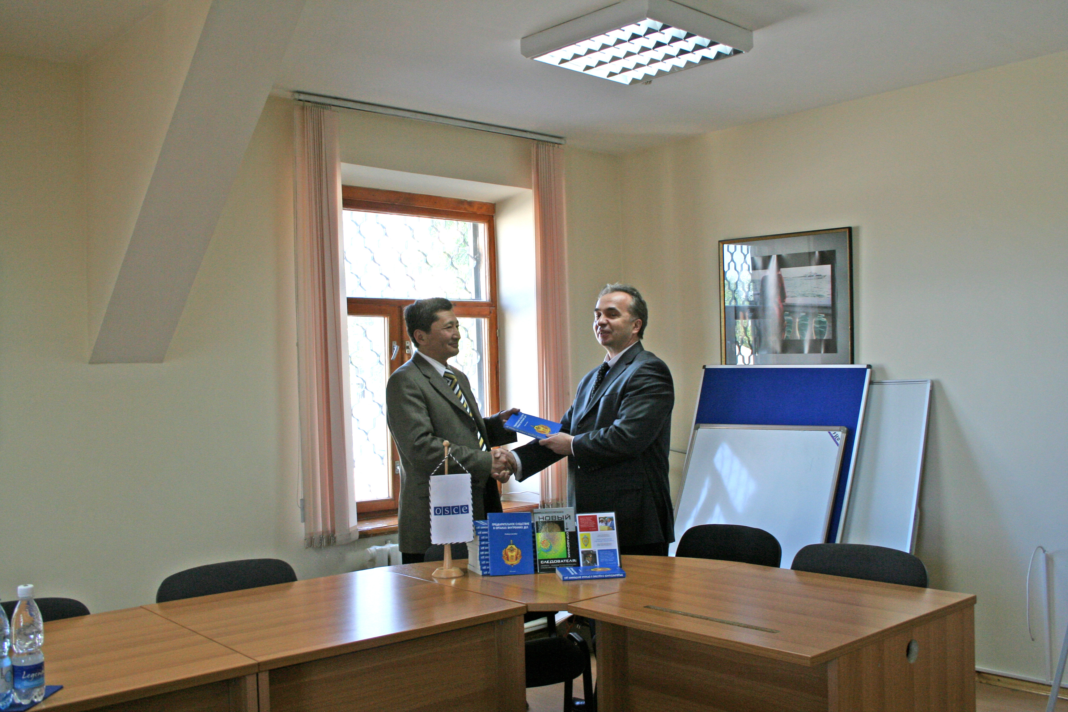Evgeny Cherenkov, Police Reform Programme Manager at the OSCE Centre in Bishkek (right), donates policing reference books to Kench Abdiev, Head of the Kyrgyz Interior Ministry's investigations department, Bishkek, 7 May 2009.
