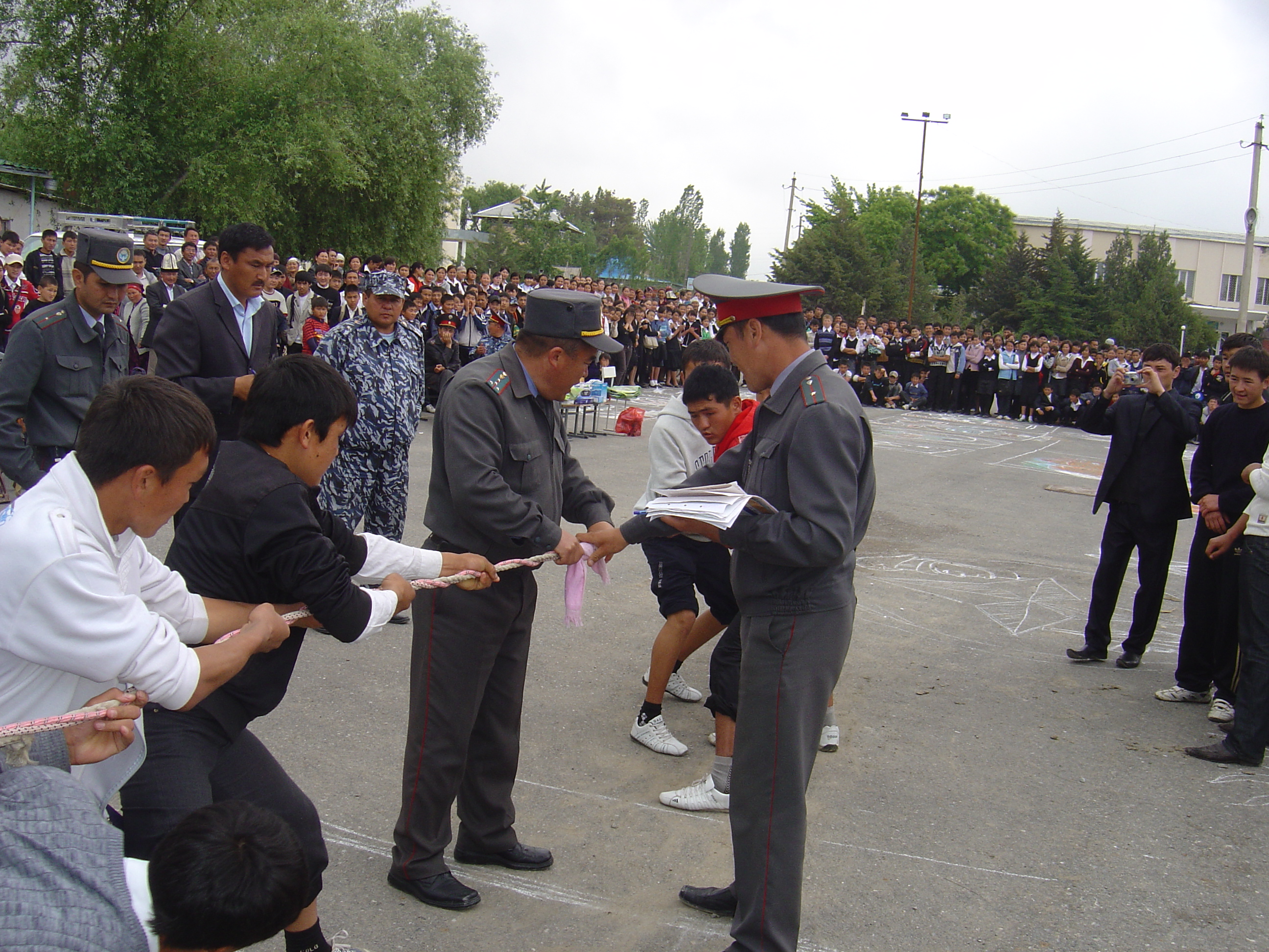 Children and police engage in a game during the police open day organized by the OSCE centre in Bishkek, Batken, 20 May 2009