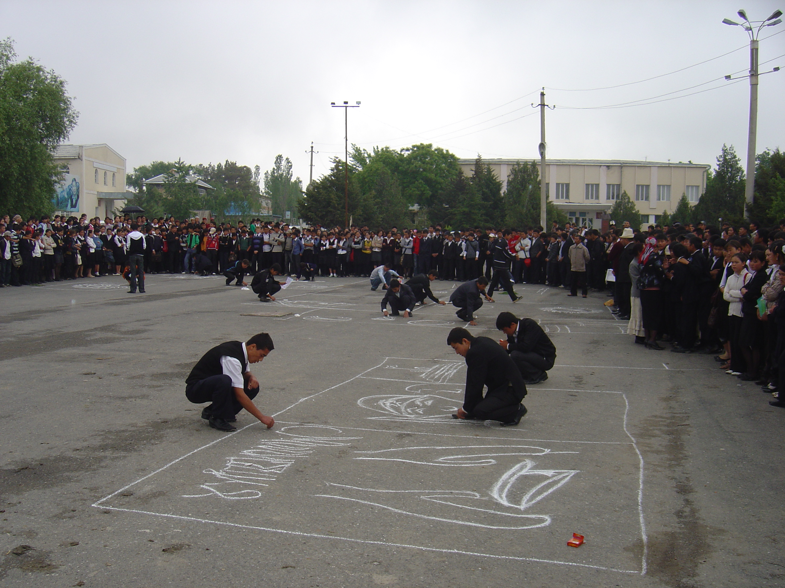 Young people engage in a pavement drawing competition on what should police look like, during the police open day organized by the OSCE centre in Bishkek, Batken City, 20 May 2009