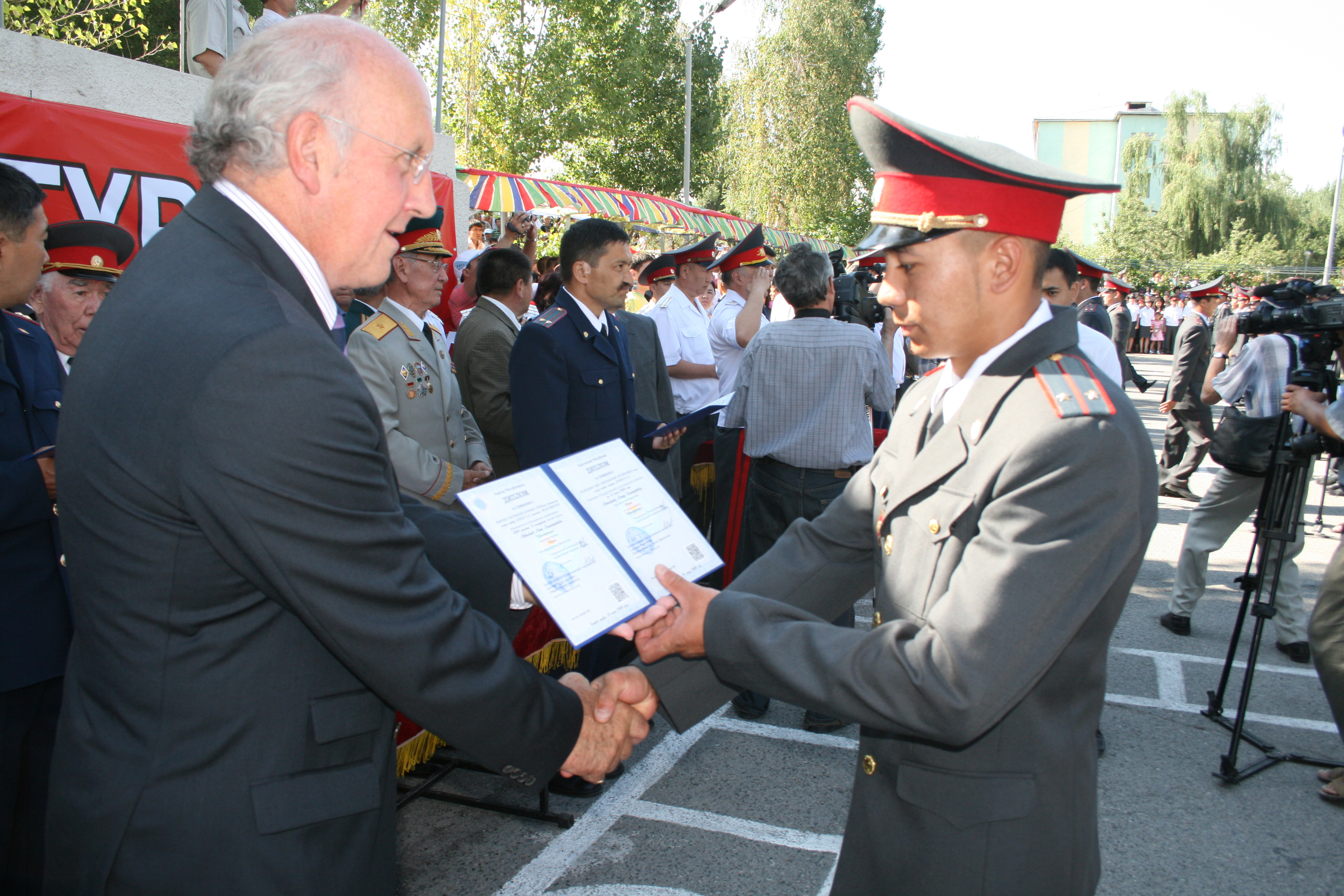 Richard Monk (left), the former OSCE Senior Police Adviser and former United Nations Senior Police Commissioner and Commissioner of Police in Kosovo, presents a certificate to a graduate of the Kyrgyz Police Academy, Bishkek, 26 June 2009.