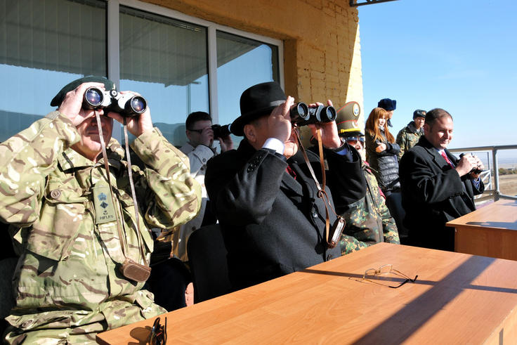 Acting Deputy Head of the OSCE Centre in Bishkek Ross Brown (right), Vice Prime Minister of Kyrgyzstan Tokon Mamytov (centre) and one the ceremony's invited guests, Defence Attache at British Embassy Astana David Harrisson (left) use binoculars to watch a controlled explosion of MANPADS and anti-tank missiles deemed surplus or unserviceable by the Kyrgyz Defense Ministry, Ala-Too military polygon, 14 November 2013.