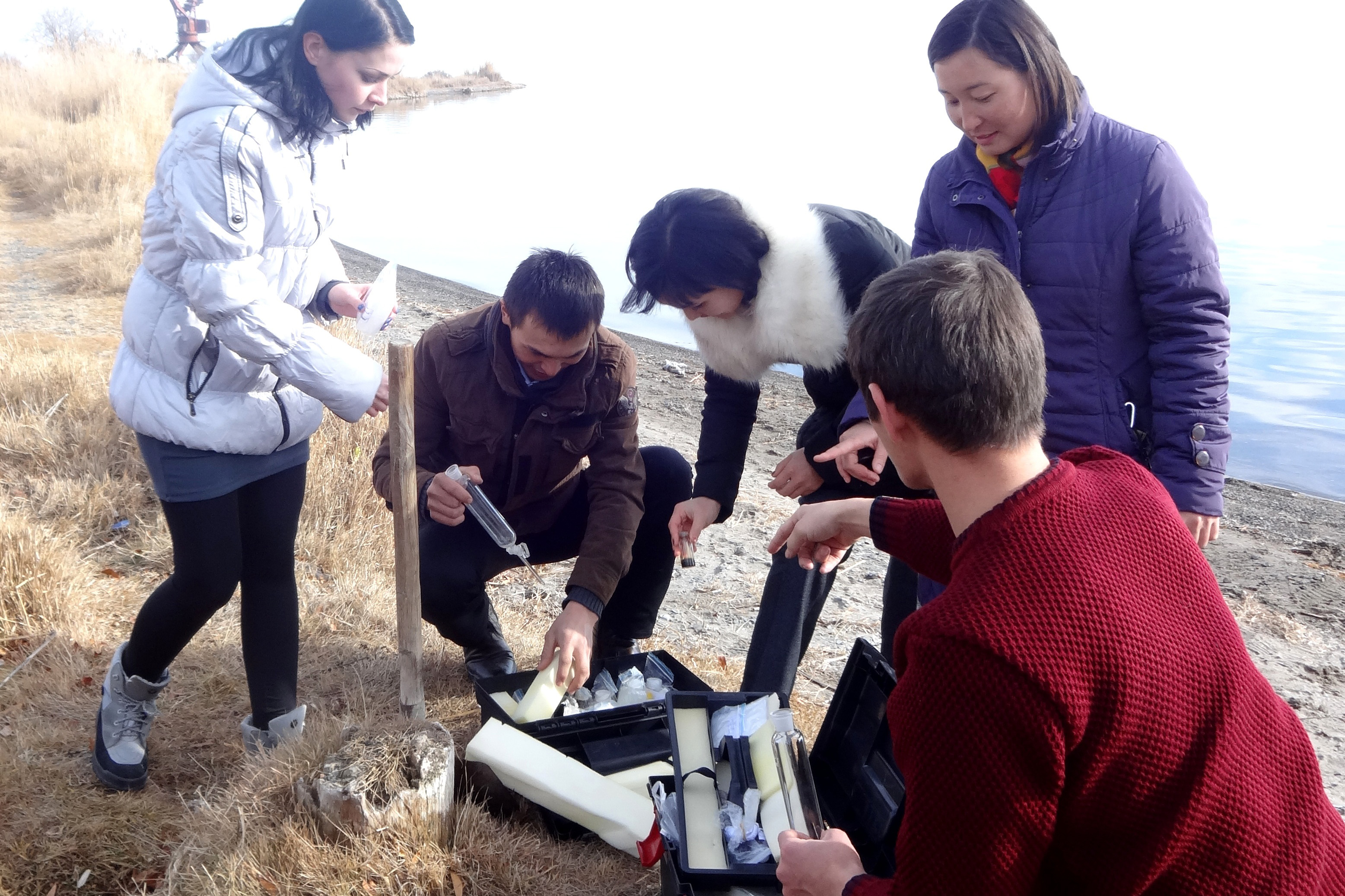 Members of the Akmena public organization take soil probe samples to detect oil pollution at the shore of Issyk-Kul lake during an OSCE-supported event aimed at raising environmental awareness, Balykchy bay, 29 November 2013.