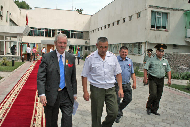 Ambassador Andrew Tesoriere (l), Head of the OSCE Centre in Bishkek, with Col. Abylmazhin Shadybekov, Head of the Anti-terrorism Bomb Disposal Centre in Bishkek, 5 August 2009.