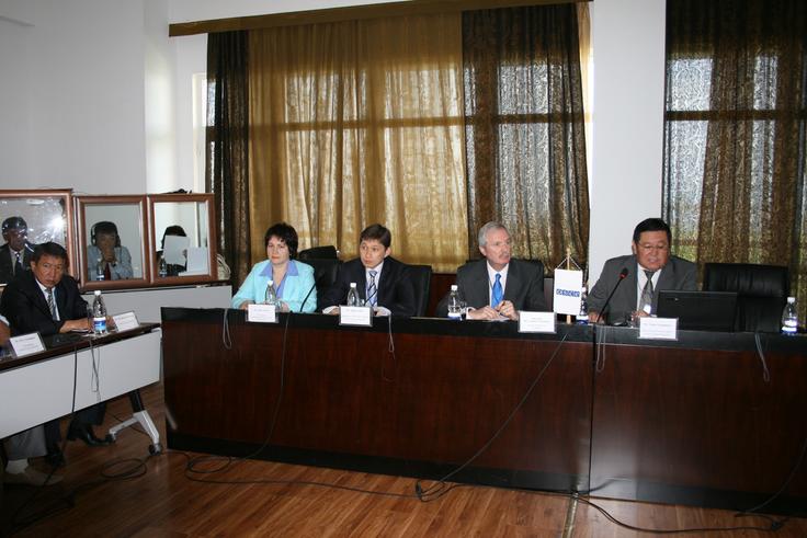 Andrew Tesoriere, Head of OSCE Centre in Bishkek (centre right) and Kyrgz Government officials Nina Valieva (left) and Tolon Turganbaev (right), at the opening ceremony of the PPP anti-terrorism conference, Issyk-Kul, 13 August 2009.