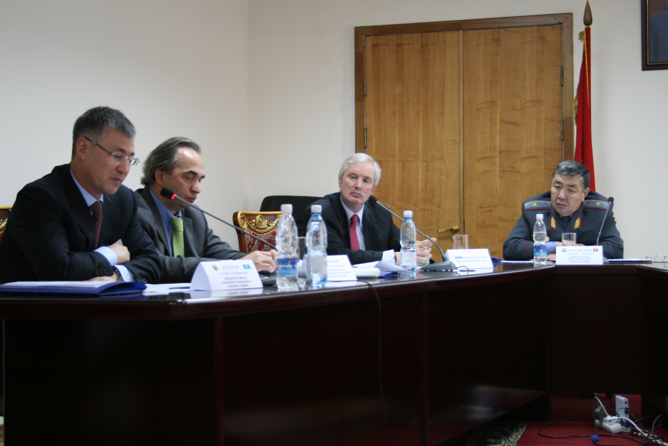 L-r: Police Committee Chairman Colonel Kusetov Sultan, OSCE Police Reform Programme Manager Evgeny Cherenkov, Head of the OSCE Centre in Bishkek Andrew Tesoriere, and First Deputy Minister of the Interior Sabyrbek Kurmanaliev, Bishkek, 25 November 2009.