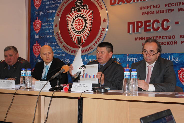 Police Colonel Shamshybek Mamyrov (2nd right), Head of the Kyrgyz Interior Ministry's Scientific Research Centre, presents the results of an OSCE-supported public opinion survey on the police in Karakol, Kyrgyzstan, 9 March 2010.