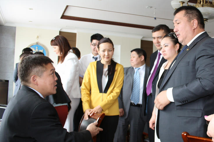 Newly-appointed Vice Consul of Mongolia to Kyrgyzstan Burenbat Demchigsuren (l), speaking with Kumanbek Dykanbaev MP (r) and representatives of the Kyrgyz Presidential Administration and Kyrgyz Ministry for Foreign Affairs at the General Service for State Registration, Ulaan Baatar, 25 June 2014.