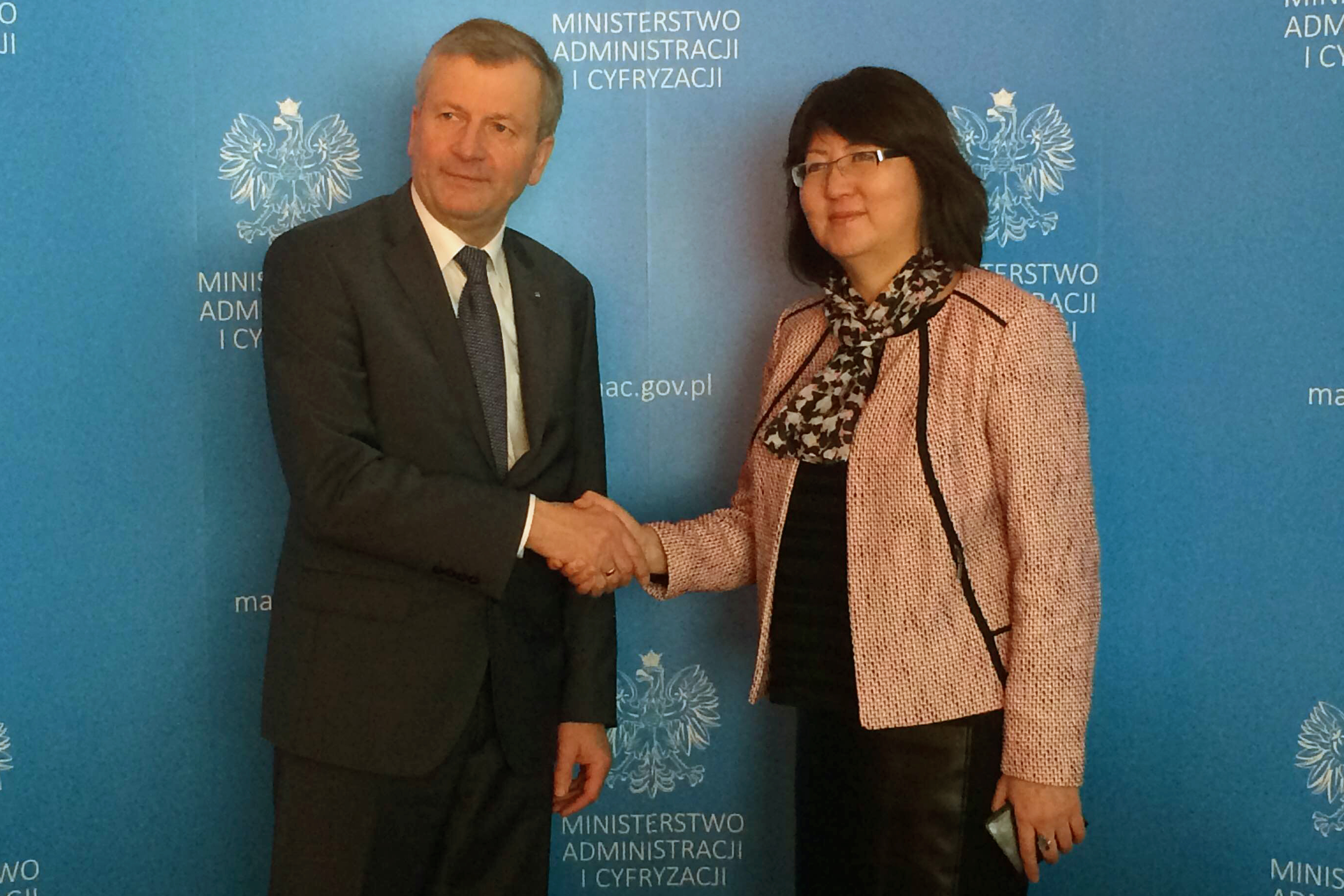 Kyrgyzstan's Deputy Minister of Culture, Information and Tourism Ainura Temirbekova (r) and Polish Deputy Minister of Administration and Digitalization Bogdan Dombrowski during a discussion on a switch-over from analogue to digital television, Warsaw, 11 March 2015.