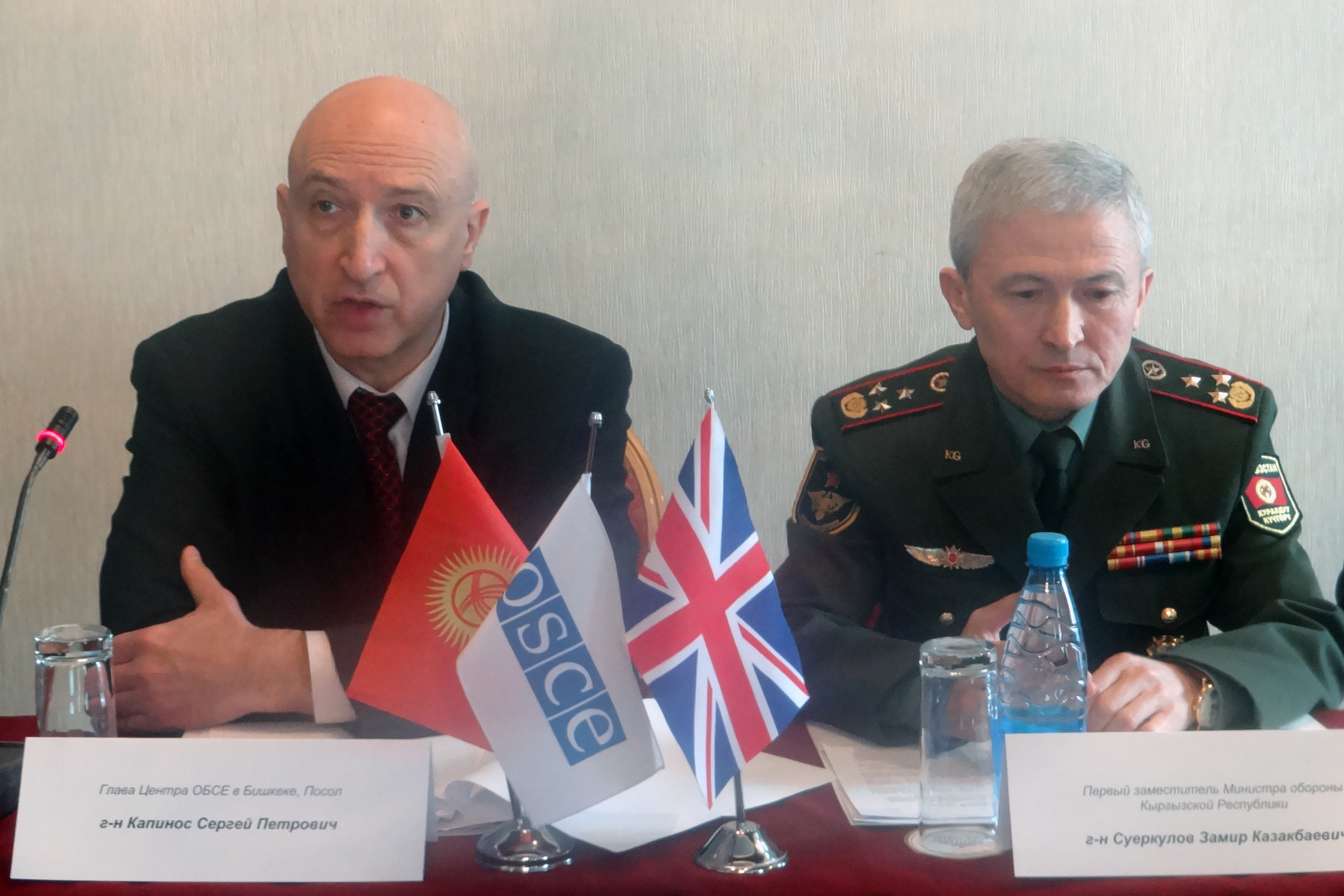Ambassador Sergey Kapinos, the Head of the OSCE Centre in Bishkek (r) and Kyrgyzstan's First Deputy Minister of Defense Zamir Suerkulov (l) during a third roundtable meeting on Improving Kyrgyzstan's legal framework on the management of Small Arms and Light Weapons and Conventional Ammunition, Bishkek, 12 march 2015.