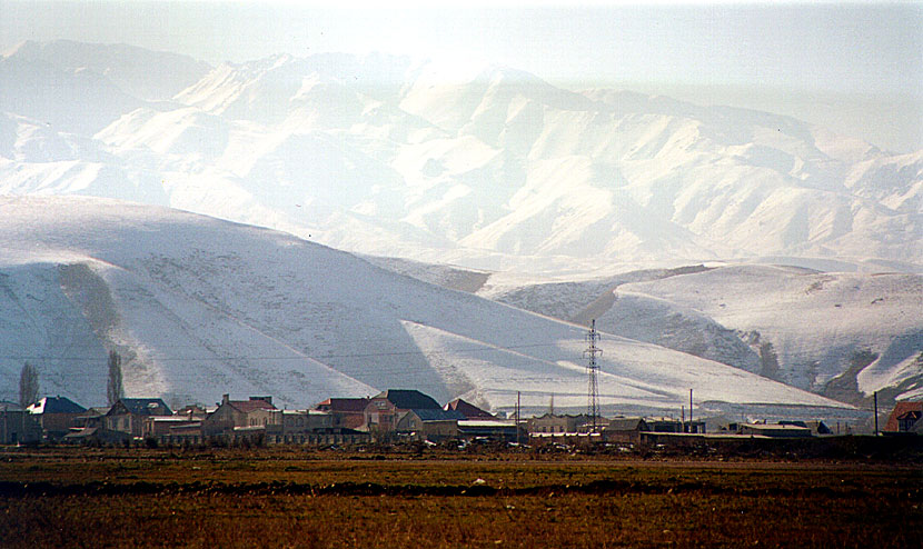 The city of Bishkek, Kyrgyzstan is surrounded by mountains, November 2000.