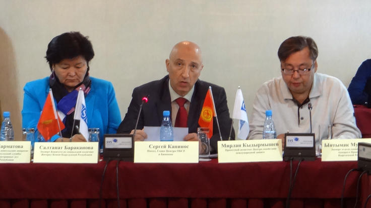 The Head of the OSCE Centre in Bishkek Ambassador Kapinos (c) at the roundtable on the prevention of human trafficking, Bishkek, 30 September 2015.