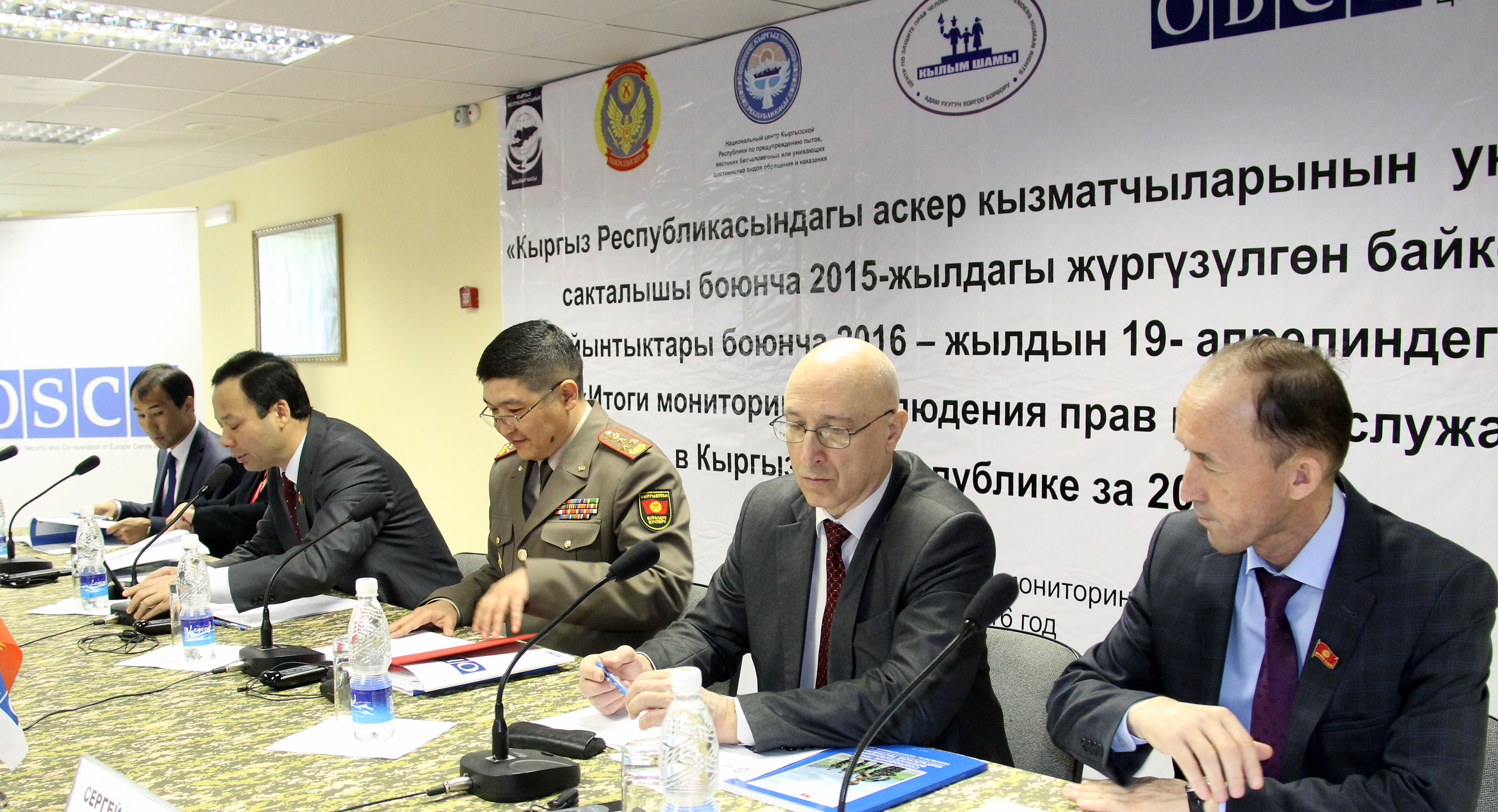 Ambassador Sergey Kapinos, Head of the OSCE Centre in Bishkek (second right), during a presentation of the report detailing the protection of human rights within the Kyrgyz Armed Forces, Bishkek, 19 April 2016.