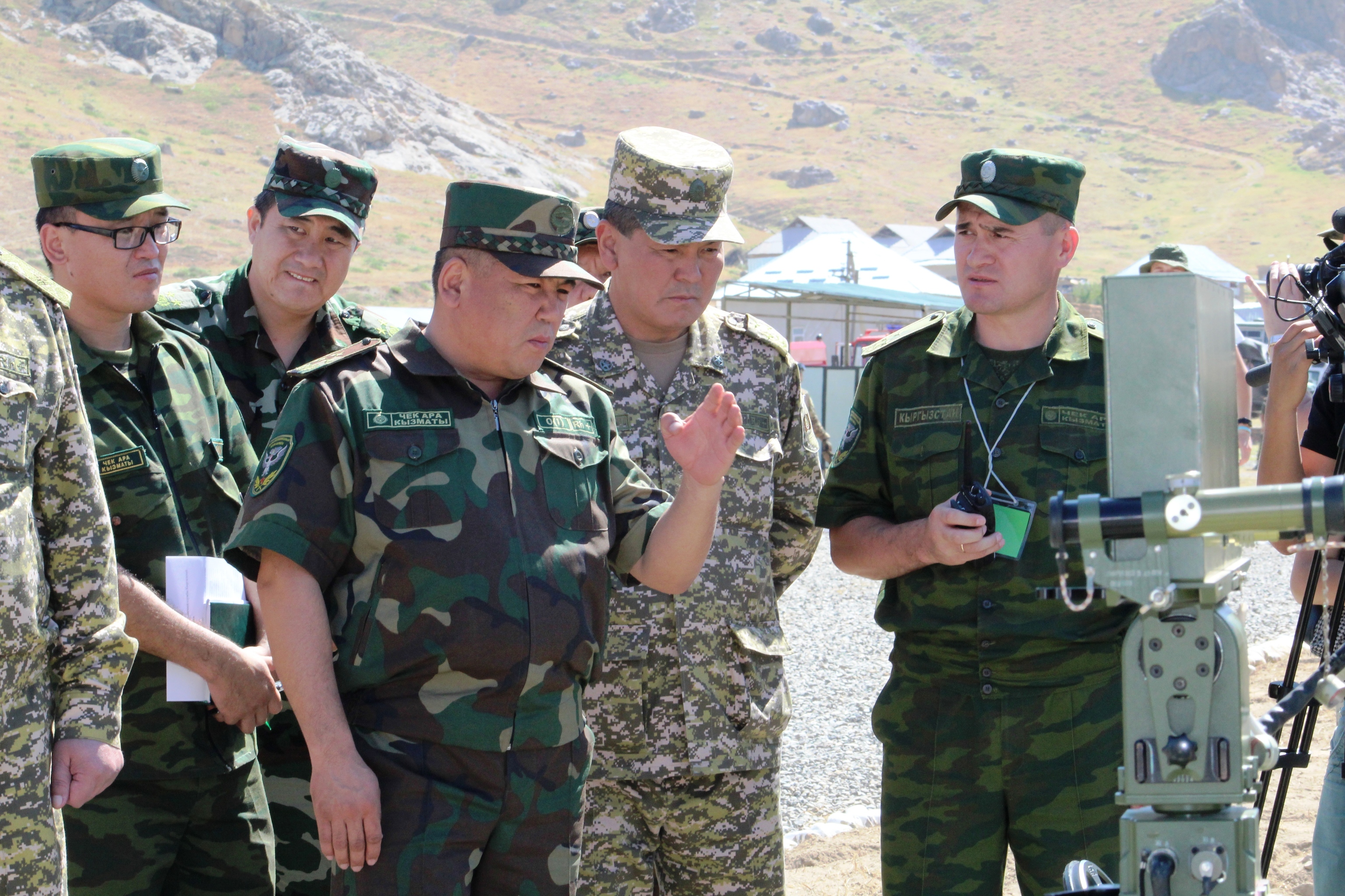 Chairman of the State Border Service (SBS) Colonel Abdikarim Alimbaev explains the work of the radio-communication equipment used by the SBS during the military Command-Staff Exercise ‘Barrier 2016’, Osh, 8 July 2016.
