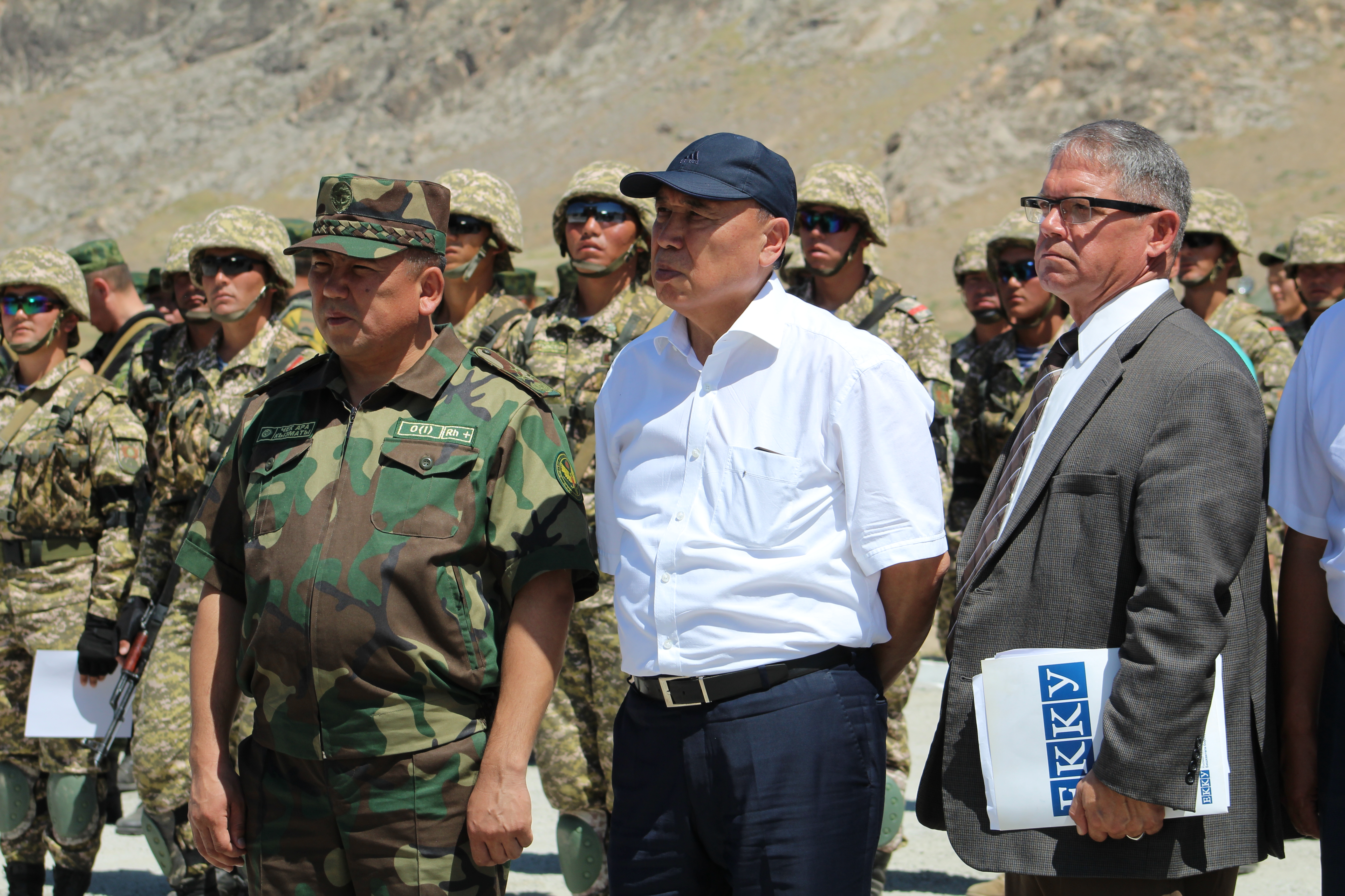 Chairman of the State Border Service (SBS) Colonel Abdikarim Alimbaev (l), First Deputy Plenipotentiary representative of the Government in Osh province Bayish Yusupov 2 (c), and OSCE Senior Field Representative William Leaf (r) listen to a speech during the military Command-Staff Exercise ‘Barrier 2016’, Osh, 8 July 2016.