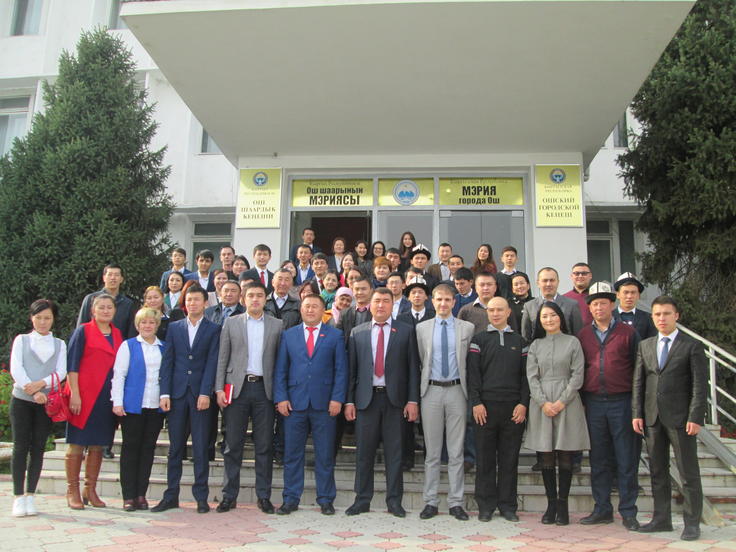 Participants of the conference on the development and sustainability of Youth Councils in Kyrgyzstan in front of the Osh city Mayor's Office in Osh, Kyrgystan, 29 October 2016.
