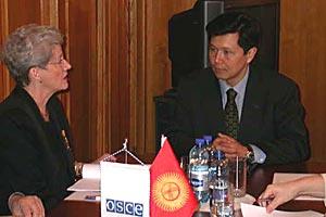 Acting Foreign Minister, Omar Sultanov, and Head of OSCE Parliamentary Assembly delegation, Paula Kokkonen, during a visit of OSCE Parliamentary Assembly members to Kyrgyzstan, 1-4 December 2002.