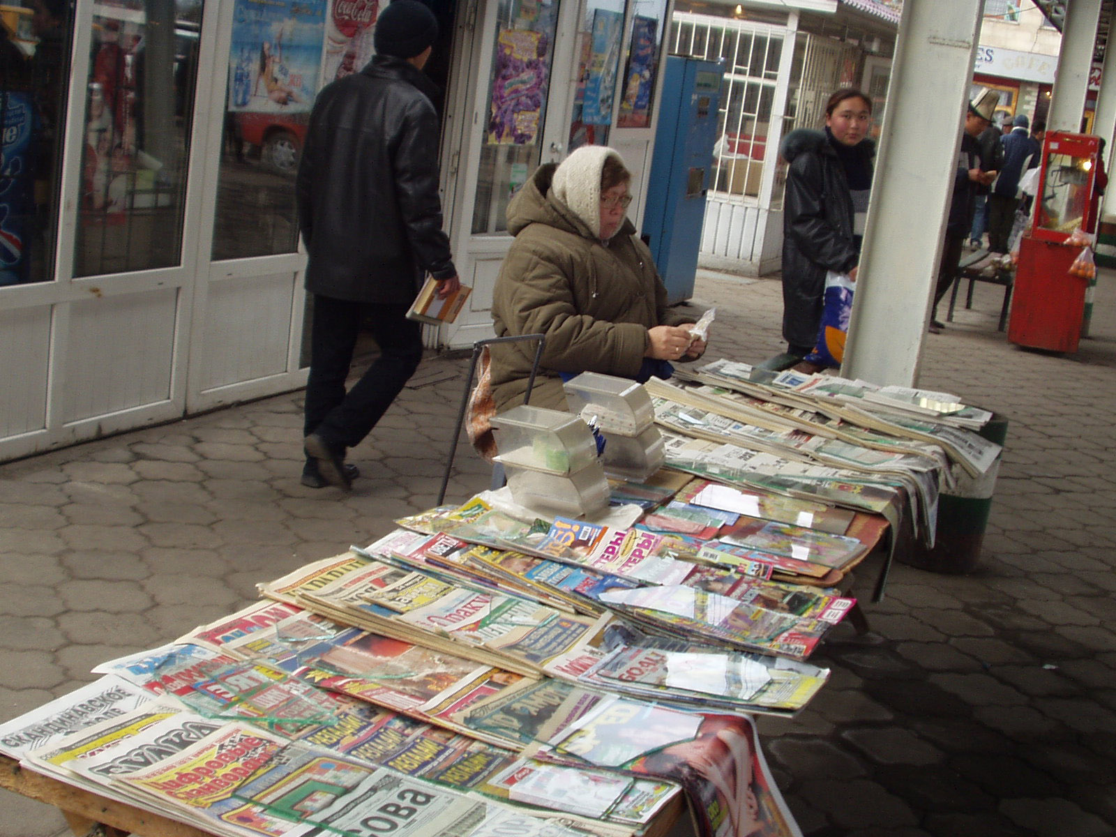A Kyrgyz woman sells newspapers and magazines on a street in Bishkek.