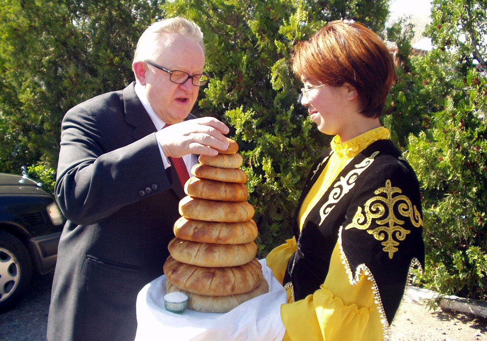 The OSCE Chairman's Personal Envoy for Central Asia, Martti Ahtisaari (left), welcomed during his visit to Kyrgyzstan, June 2004.