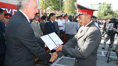 At the ceremony Richard Monk, the former OSCE Senior Police Adviser and former United Nations Senior Police Commissioner and Commissioner of Police in Kosovo, also presented the Endeavour Cup to police cadet Ulan Ermatov for his academic achievements.