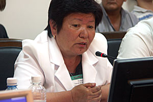Toktobubu Madieva, the Head of Minkush District Administration, addresses a meeting on the threat of radioactive dumps in the Minkush area, Bishkek, 14 June 2006.