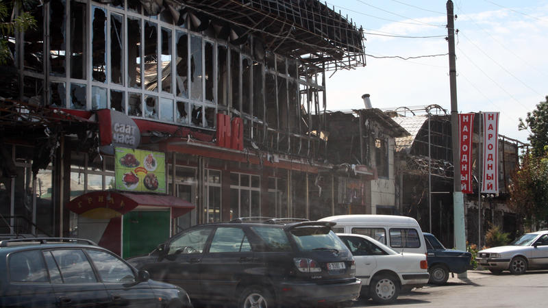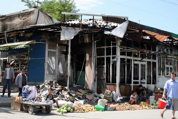 A market stall is set up outside a burnt-out building in Osh, Kyrgyzstan, as people try to rebuild their lives following the violent unrest there in June.