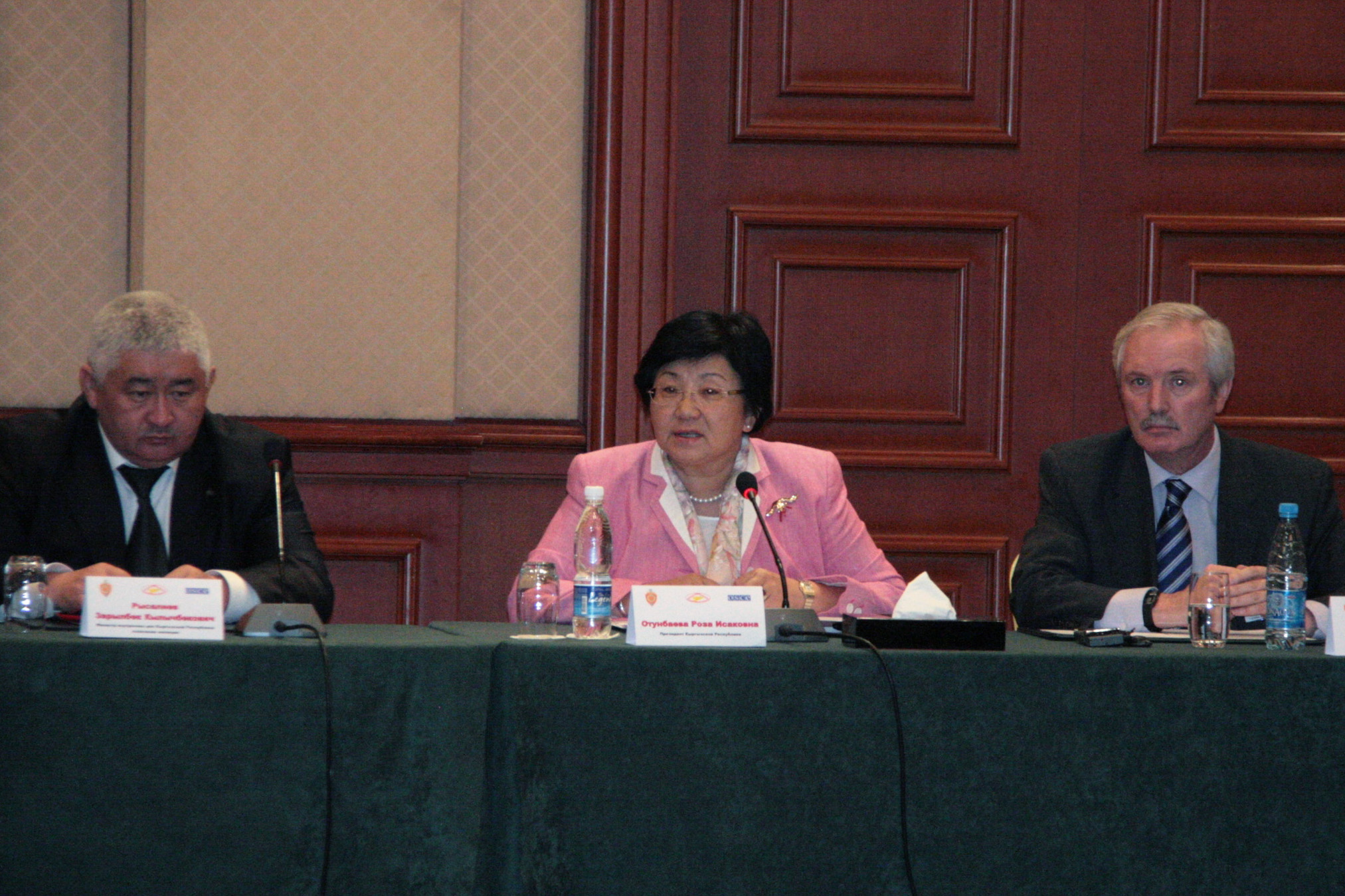 L-r: Minister of Interior Col. Zarylbek Rysaliev, President Roza Otunbaeva and the Head of the OSCE Centre in Bishkek Ambassador Andrew Tesoriere at the opening of the Constituent Assembly of the Association of Women Police in Kyrgyzstan, 1 October 2010.