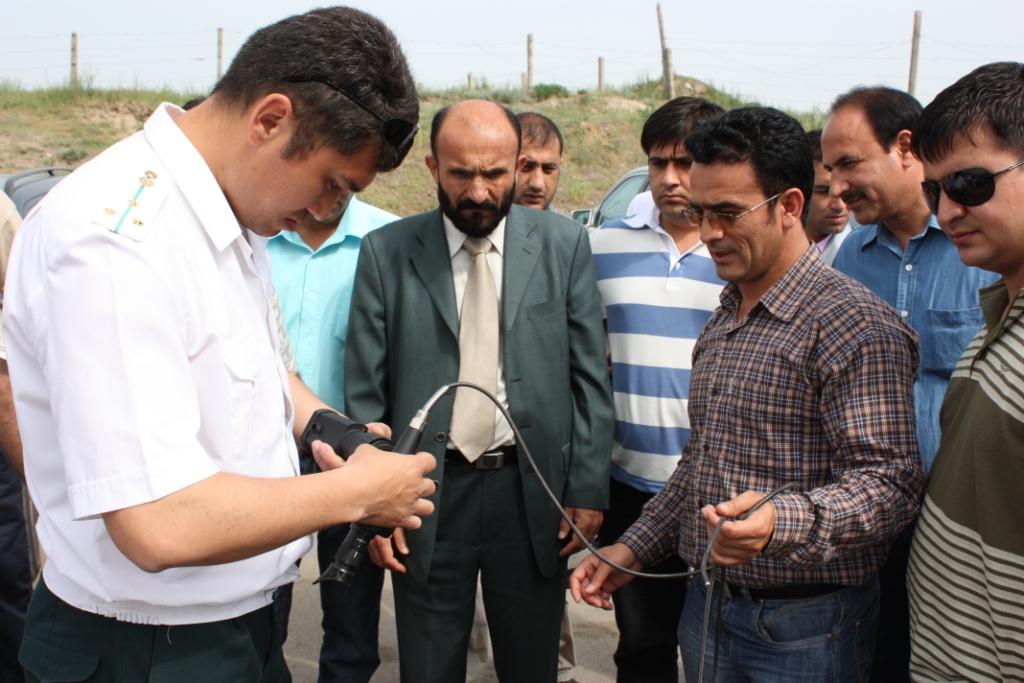 Ernis Japarov, Customs Training Centre instructor, shows customs officers from Afghanistan how to use a fibre-optic scope during a training session on searching vehicles, Bishkek, 27 April 2011.