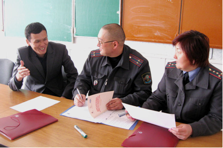 L-r: Ilyas Kolopov, trainer; Murat Munduzbaev, Head of the Juvenile Delinquency at the General Directorate of Public Security of the Ministry of the Interior, and Jamilia Toktogulova, Juvenile Delinquency Inspector from Karakol, during a training session on young offenders, Karakol, 13 May 2011.