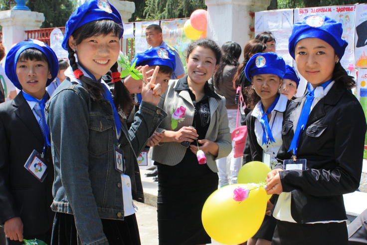 A school team prepares for a competition at a sports and art event in Karakol, Kyrgyzstan, 1 June 2011.