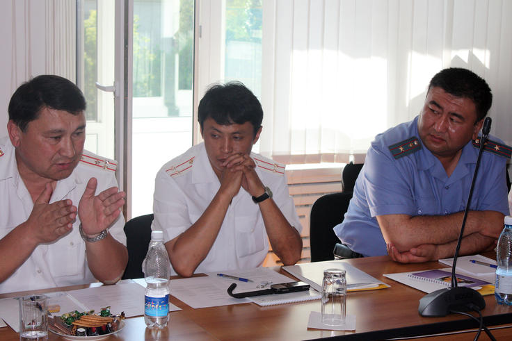 Melis Abdrahmanov, Deputy Chief of the Sverdlovsky police department (left), briefs participants on the OSCE-supported Neighbourhood Watch project, Bishkek, 21 June 2011.