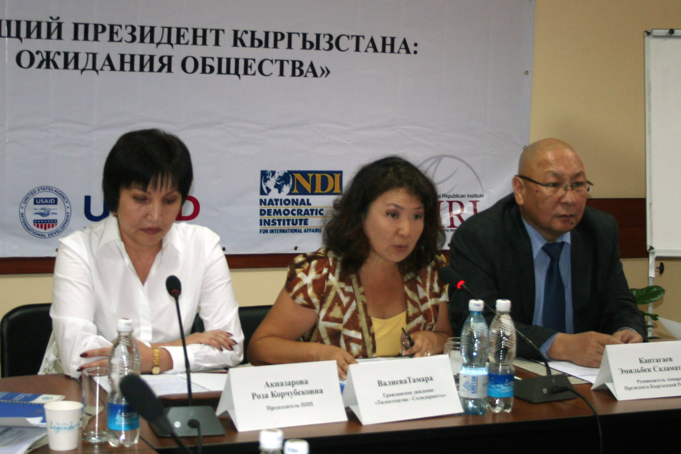 L-r: Roza Aknazarova, the Chairperson of the Parliament of Political Parties, Tamara Valieva, of the civil movement 'Tilektesh' (Solidarity) and Emilbek Kaptagaev, the Chief of the Presidential Administration, at the opening of a forum on the society's expectations of the future President of Kyrgyzstan, Bishkek, 16 August 2011.
