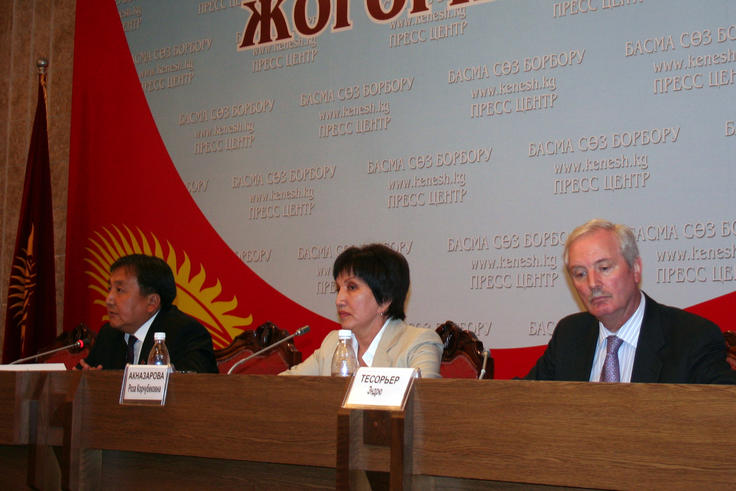 L-r: The Deputy Speaker of Kyrgyzstan’s Parliament Asylbek Jeenbekov, the Chairperson of the Parliament of Political Parties Roza Aknazarova and the Head of the OSCE Centre in Bishkek Ambassador Andrew Tesoriere, at the opening of a discussion on forthcoming presidential elections, Bishkek, 10 September 2011.