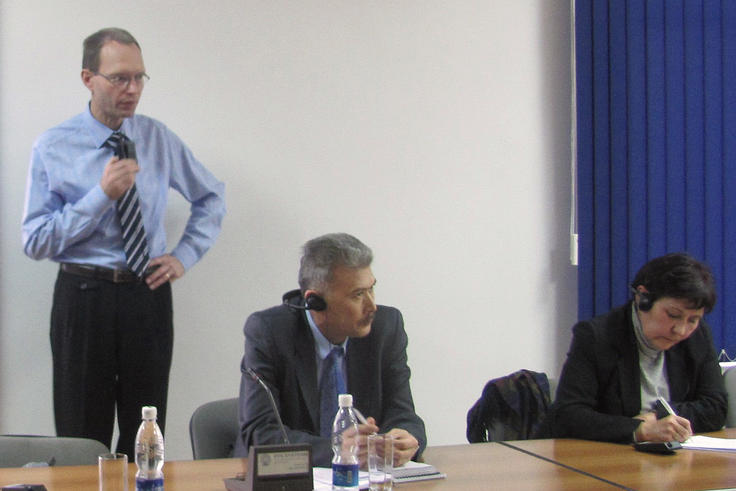Christian Pitschas (l), expert trainer, delivers a course on developing an efficient international trade programme for Kyrgyzstan, Bishkek, 21 November 2011.