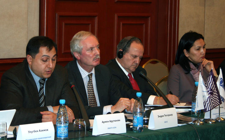 L-r: Regional Representative of the UN High Commissioner for Human Rights in Central Asia Armen Harutyunyan, the Head of the OSCE Centre in Bishkek Ambassador Andrew Tesoriere, UN Special Rapporteur on Torture Juan Méndez and Prosecutor General of the Kyrgyz Republic Aida Salyanova, at a round table on torture prevention, Bishkek, 13 December 2011.