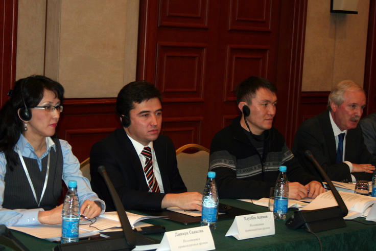 Director of the Independent Human Rights Group Dinara Sayakova, IHRG expert Ulugbek Azimov, Deputy Director of Freedom House Almaz Esengeldiev and Head of the OSCE Centre in Bishkek Ambassador Andrew Tesoriere, Bishkek, 19 December 2011.