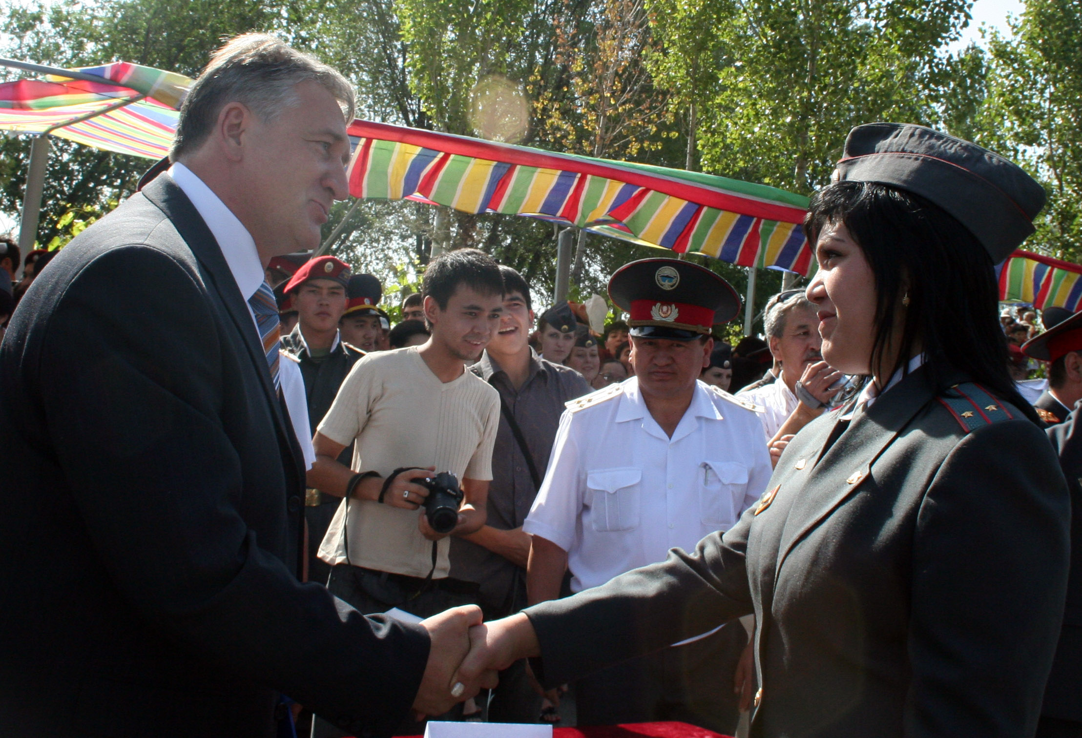 A female graduate of the Kyrgyz Police Academy receives her diploma, in Bishkek, 3 July 2008.