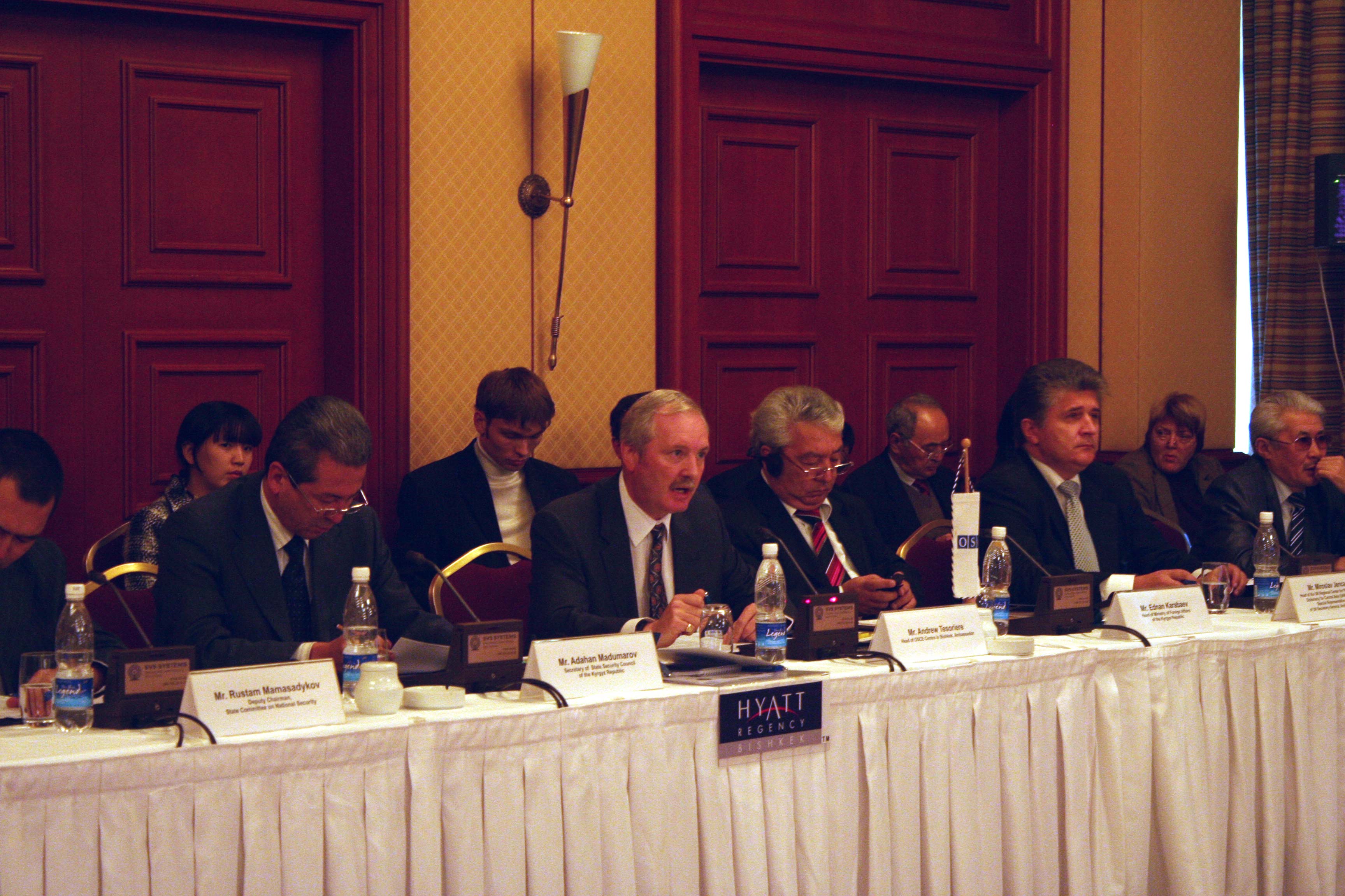 Ambassador Andrew Tesoriere (centre), Head of the OSCE Centre in Bishkek, addresses a conference on partnerships between the state, civil society and the private sector to combat terrorism, Bishkek, 4 November 2008.