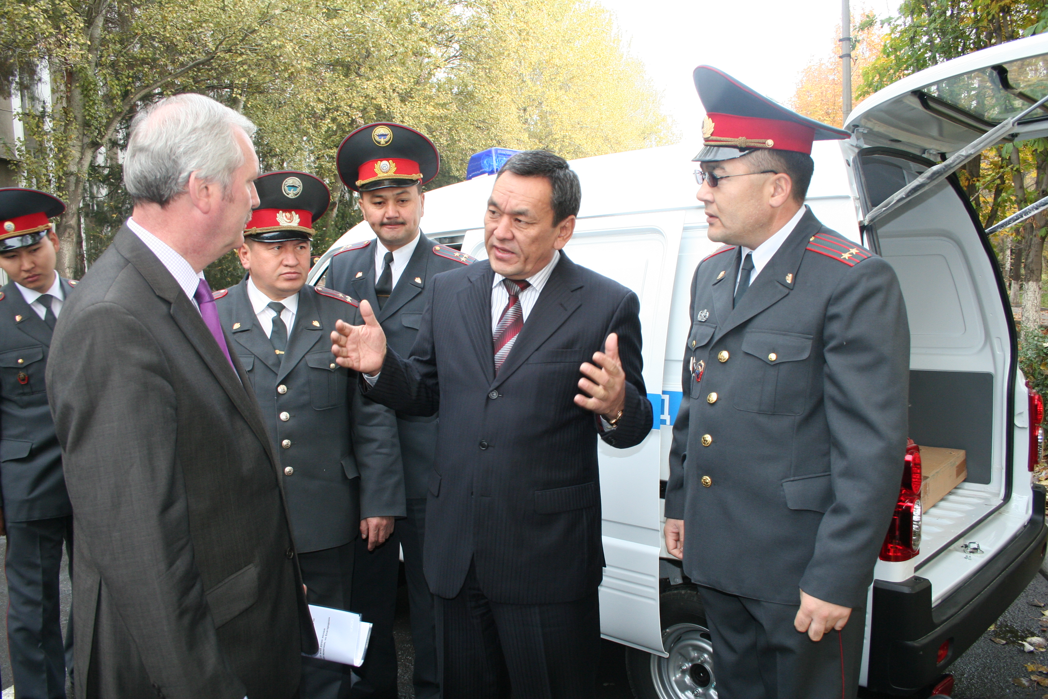 The Head of the OSCE Centre in Bishkek, Ambassador Andrew Tesoriere (l) and Kyrgyzstan's Interior Minister Moldomusa Kongantiev (c) in front of a mobile forensics laboratory donated by the Centre to the Ministry, 5 November 2008.