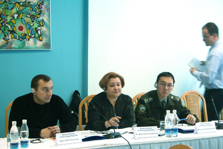Officers of the Kyrgyz border service at Manas airport during a two-day evaluation of the country's system for lost and stolen ID documents organized by the OSCE Centre in Bishkek, 25 November 2008.