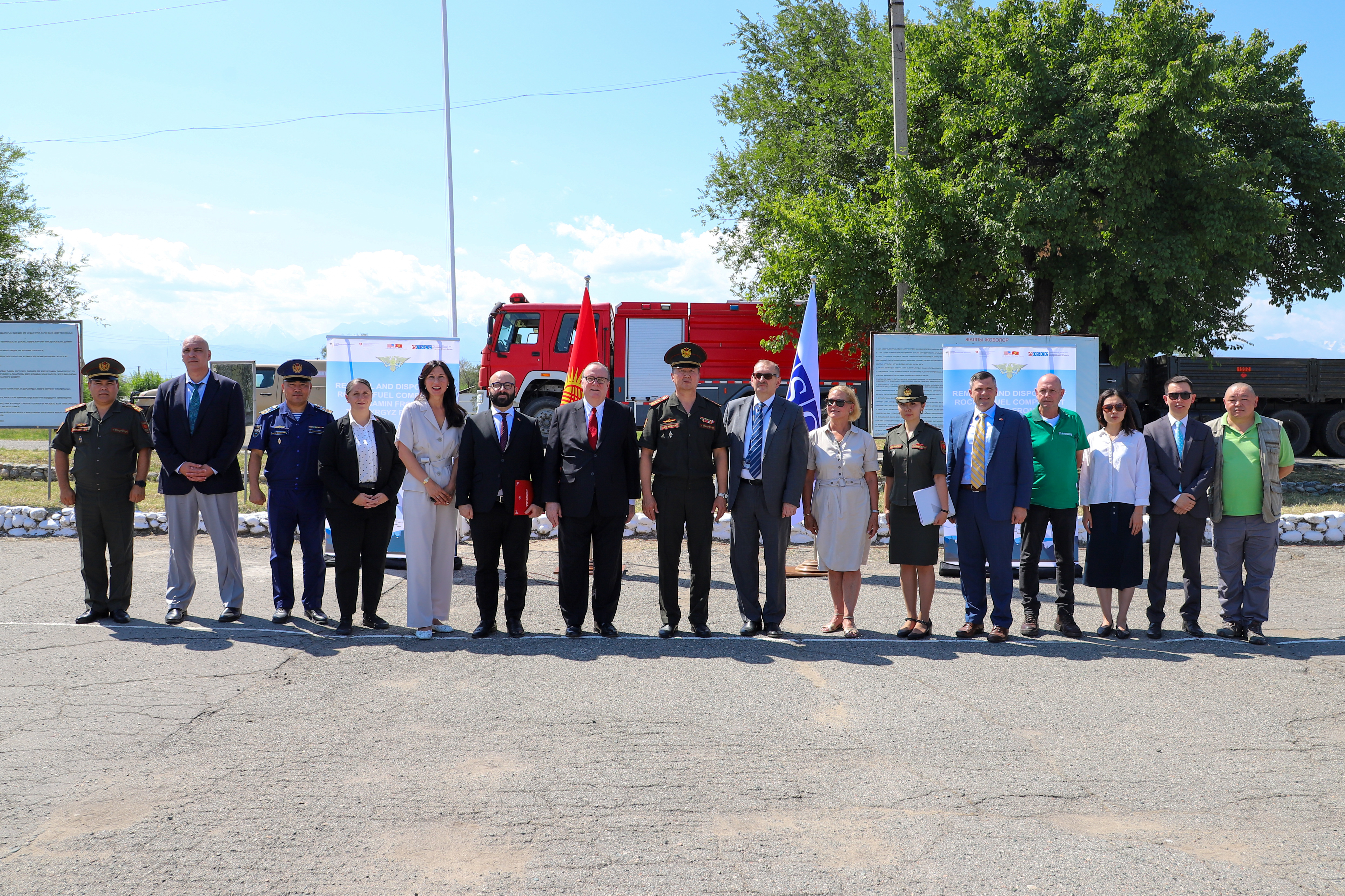 Representatives of the Ministry of Defense of the Kyrgyz Republic, OSCE, U.S. Embassy, German Embassy, and Swiss Embassy at the "Samin" toxic fuel removal ceremony. Novopavlovka village, Chui province, Kyrgyzstan.