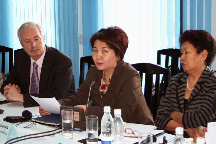 L-r: Ambassador Andrew Tesoriere, the Head of the OSCE Centre in Bishkek, Feruza Djamasheva, the Chairperson of the Supreme Court of Kyrgyzstan, and Dinara Bekboeva, a Judge from the Supreme Court of Kyrgyzstan, at a roundtable on strengthening judicial independence, Bishkek, 20 April 2011.