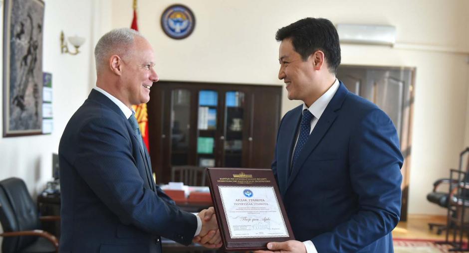 Премьер-министр Улукбек Марипов (оңдо) Бишкектеги ЕККУнун Программалык кеңсесинин жетекчиси Пьер фон Аркска (солдо) ЕККУ менен Кыргызстан ортосундагы кызматташтыкты чыңдоого кошкон салымы үчүн Кыргыз Республикасынын Өкмөтүнүн Ардактуу грамотасын тапшырды, 2021-жыл 26-февраль (Кыргыз Республикасынын Өкмөтүнүн басма сөз кызматы)