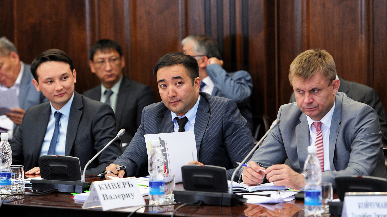 The chief executive officer of the International Business Council Askar Sydykov (l), Head of the Regulatory Reform Unit project Nurmambet Toktomatov, and the Deputy Head of the OSCE Programme Office in Bishkek Valeriu Chiveri (r), during the Kyrgyz governmental session on regulative reform, Bishkek, 8 June 2017.
