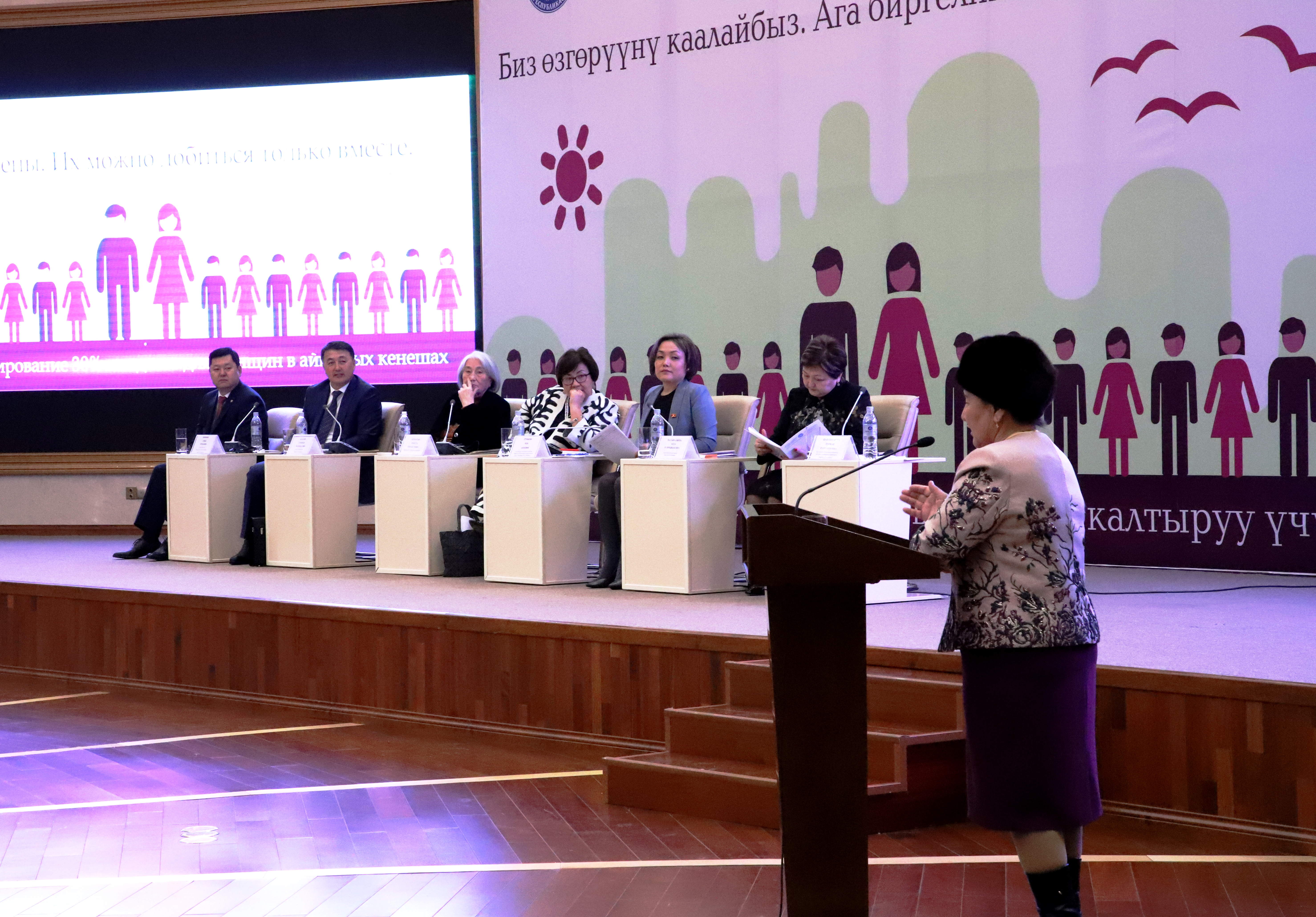 Participants of the National Forum “We support the 30% gender quota in village councils!” discuss women’s equal participation in decision-making, Bishkek, 5 March 2019.
