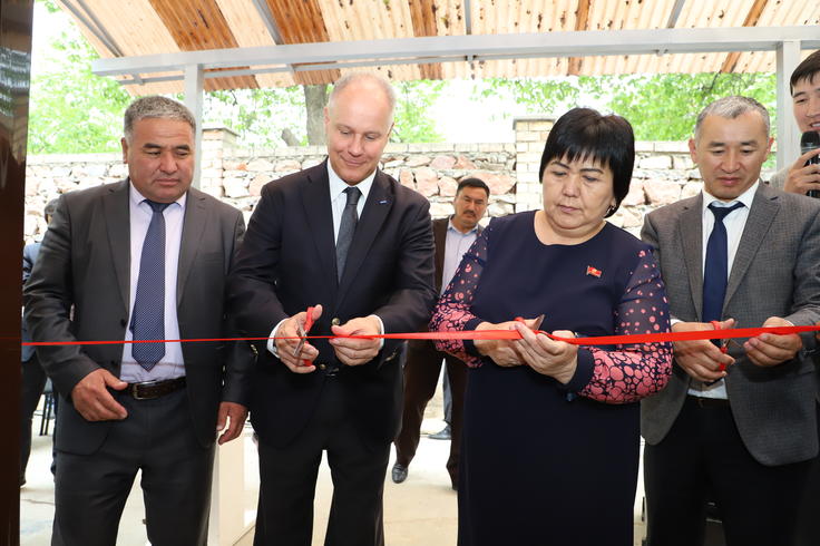 L-R: Mamyrzhan Rakhimov, Mayor of Batken, Pierre von Arx, Head of OSCE Programme Office in Bishkek, Karamat Orozova, Member of National Parliament, and Munarbek Nasirov, Chief of Staff at the Batken Governor’s Office, during the opening ceremony of the new Entrepreneurship Support Centre in southernmost city of Batken, Kyrgyzstan, 17 May 2019.