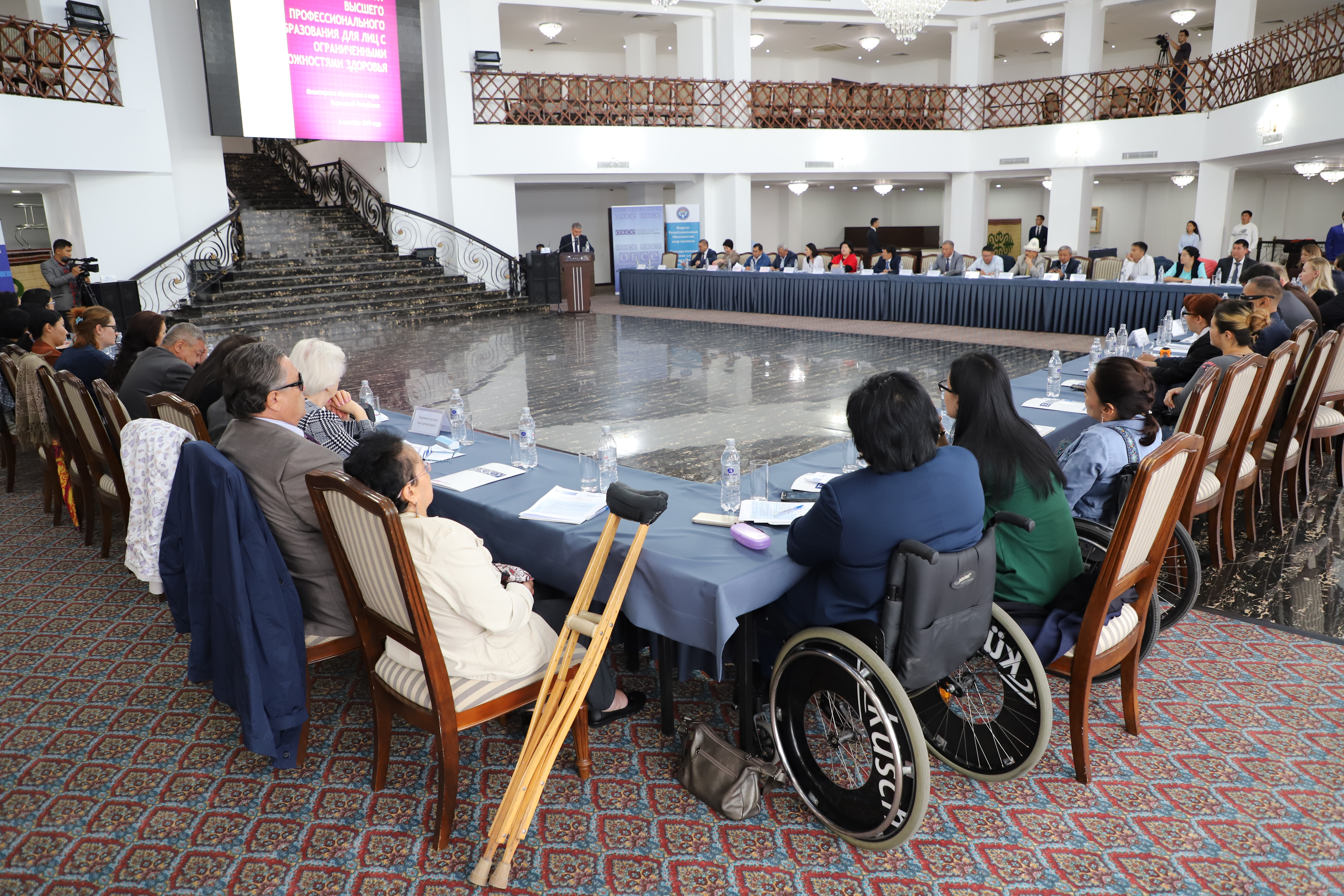 Participants of the OSCE-supported round table for development of inclusive employment processes for persons with disabilities (PwD) in the state and municipal service discuss current trends in the Kyrgyz Republic together with representatives of the Kyrgyz State Personnel Service, the Ministry of Labour and Social Development.